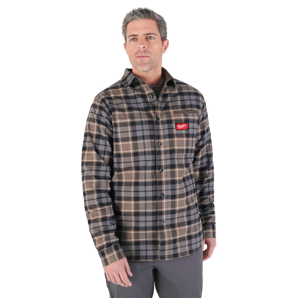 The Milwaukee GRIDIRON Flannel Shirt is a rugged workwear essential designed to withstand the harsh conditions of the jobsite. Built with heavyweight 100% cotton fabric, this shirt provides the warmth and durability required for professional use while remaining breathable for all-day comfort. This model, identifying as part of the GRIDIRON series (related to the M551G line), features reinforced high-wear zones to prevent tearing and extend the garment's life. The solid gray design offers a versatile, professional appearance suitable for both on-site labor and off-duty wear.