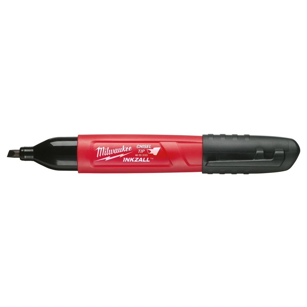 The Milwaukee INKZALL Black Chisel Tip Marker is a professional-grade marking tool engineered to thrive in the most demanding jobsite environments. Equipped with a proprietary clog-resistant tip, it maintains its shape and performance even when marking on abrasive materials like OSB, cinder blocks, and concrete. This versatile marker ensures your layout remains visible by writing clearly through wet, oily, or dusty surfaces that cause standard markers to fail.