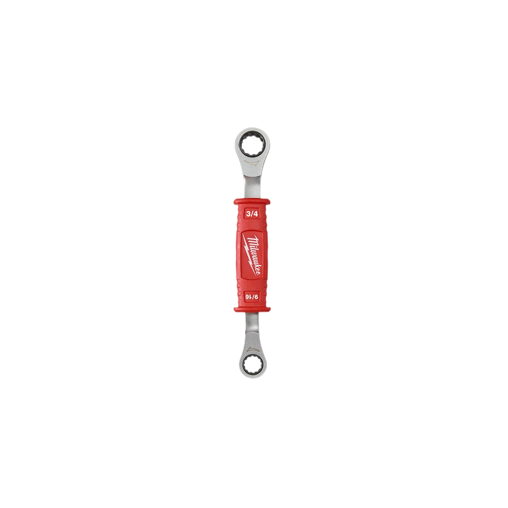 The MILWAUKEE Linemans 2in1 Insulated Ratcheting Box Wrench is designed for professionals working in or around energized equipment, providing 1000V UL Classified protection. This dual-size solution features integrated 9/16' and 3/4' 12-point sockets to cover the most common hardware sizes, eliminating the need for multiple tools on a belt. Its durable forged steel construction ensures a long tool life while delivering the mechanical leverage required for high-torque applications.