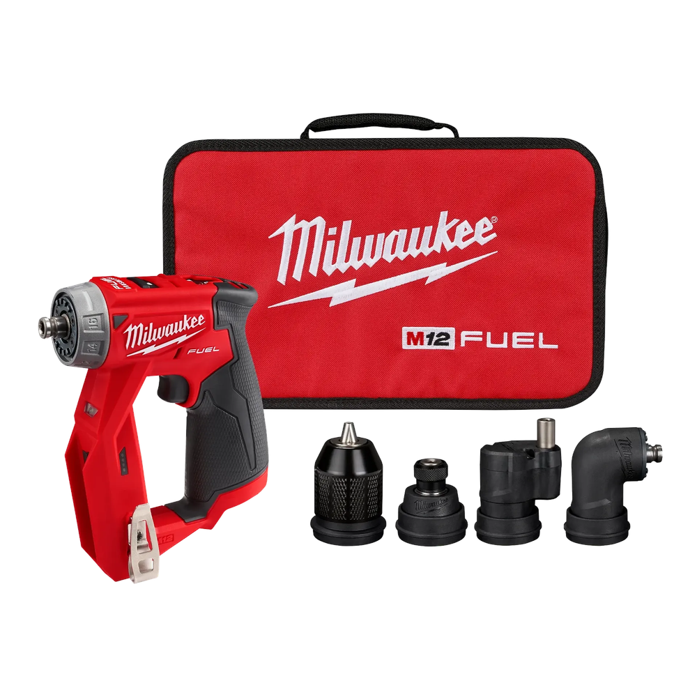 The Milwaukee M12 FUEL Installation Drill/Driver is a versatile 4-in-1 drilling and driving solution specifically designed to provide unrivaled access and control in uniquely challenging locations. It features four dedicated interchangeable headsa 3/8' metal chuck, offset driver, 1/4' hex, and right anglewhich can each be attached in 16 different positions to navigate tight corners and obstacles. The tool's slim profile and inline grip provide superior axial pressure and balance, while the flat-top design allows for flush placement against surfaces. Powered by a brushless motor, this compact tool delivers the performance needed for specialized installation work in cabinetry, electrical, and HVAC systems.
