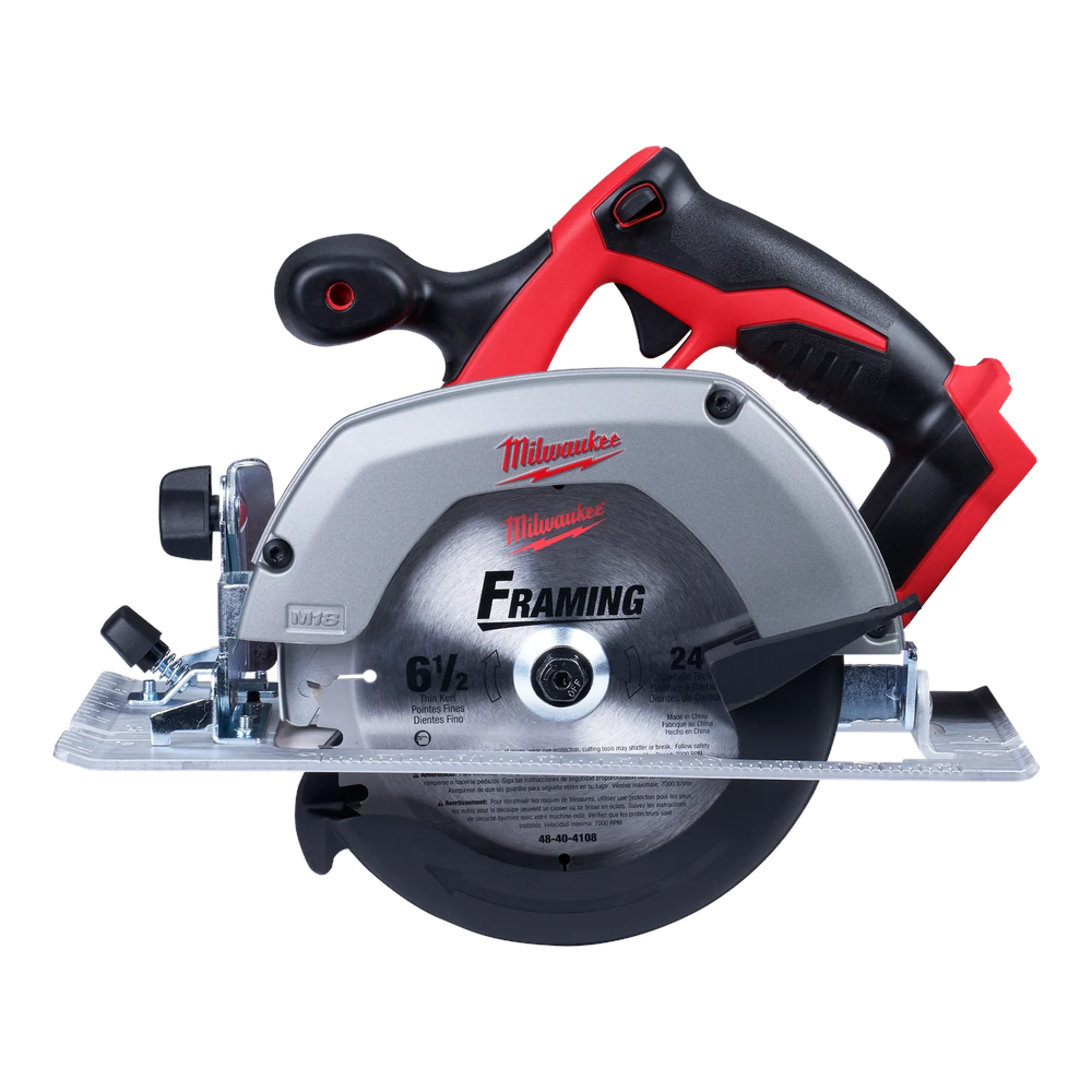 The Milwaukee M18 6-1/2' Circular Saw is designed to provide powerful, lightweight cutting for a variety of jobsite applications including plumbing, electrical, framing, and finishing. This high-performance saw features a 3,500 RPM motor that quickly cuts through tough materials such as LVL headers with ease. Built for maximum durability, it is equipped with magnesium upper and lower guards to protect the blade from drops and harsh conditions. The ergonomic soft-grip handle and lightweight aircraft aluminum shoe ensure superior comfort and balance for accurate, controlled cuts throughout the workday.