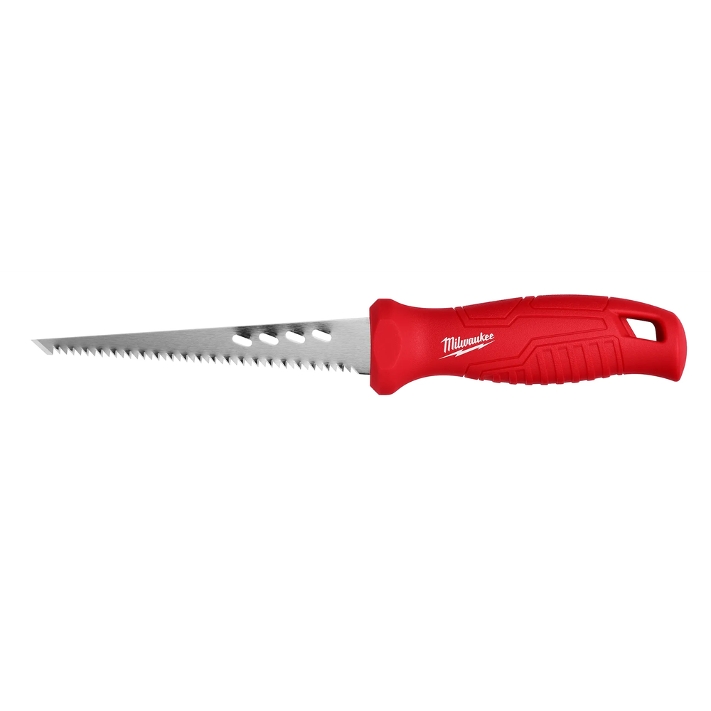 The Milwaukee Rasping Jab Saw is a specialized hand tool designed specifically for contractors and builders working with drywall and plaster. It stands out as the only jab saw on the market with integrated rasping holes along the blade's side, allowing users to smooth rough edges and expand holes instantly without switching tools. The saw features a thick, durable 6-inch blade with a piercing tip that is ideal for effortless plunge cuts and material penetration. Its ergonomic anti-roll handle and rubber over-mold provide superior grip, comfort, and safety on the job site.