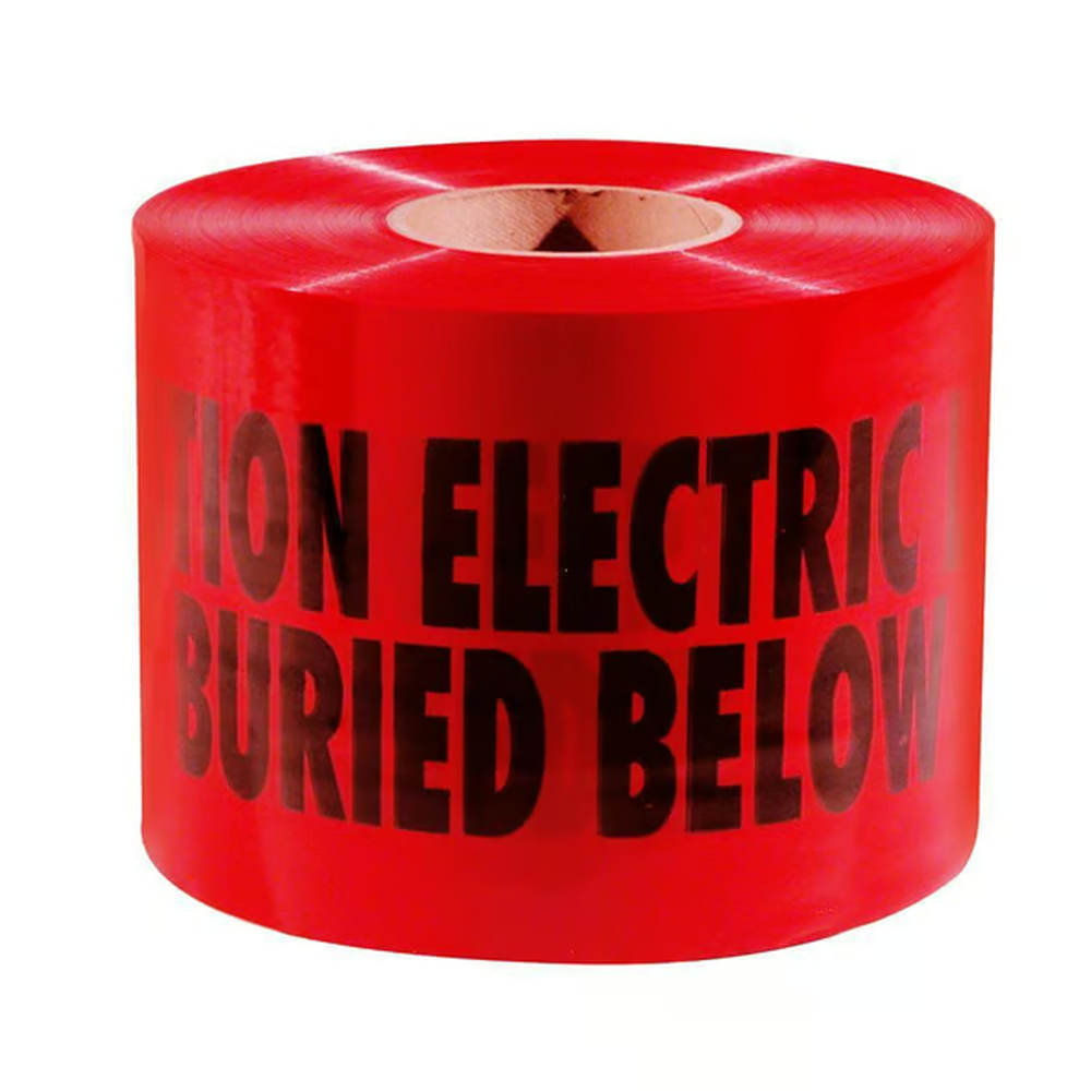 Bold black lettering displays the 'CAUTION ELECTRIC LINE BURIED BELOW' warning for immediate identification.