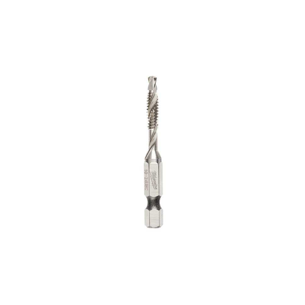 The Milwaukee SHOCKWAVE 10-24 UNC Impact Drill Tap is an innovative tool designed to streamline metalworking tasks by combining drilling and tapping into a single operation. Engineered for use with impact drivers and drill drivers, this bit is ideal for working with metal up to 1/4 inch thick. Its features, such as a built-in countersink and laser-etched size for easy identification, enhance efficiency and accuracy on the job. This durable accessory is built to withstand the high-torque demands of modern job sites.