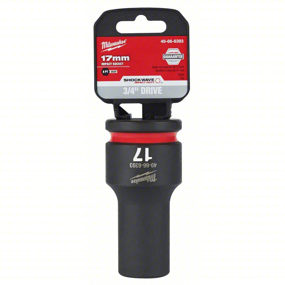 Experience extreme durability and precision with the Milwaukee SHOCKWAVE Impact Duty 3/4' Drive 17MM Deep 6 Point Socket. Engineered for high-torque applications, this socket features robust forged steel construction and a non-slip hex geometry to prevent fastener rounding. The bold, ink-filled size markings ensure quick and accurate selection, even in demanding environments. Its dual-hole design and ring groove facilitate easy attachment and removal, making it an essential tool for professionals. All SHOCKWAVE Impact Duty Sockets are backed by a Lifetime Guarantee and meet ASME industry standards.