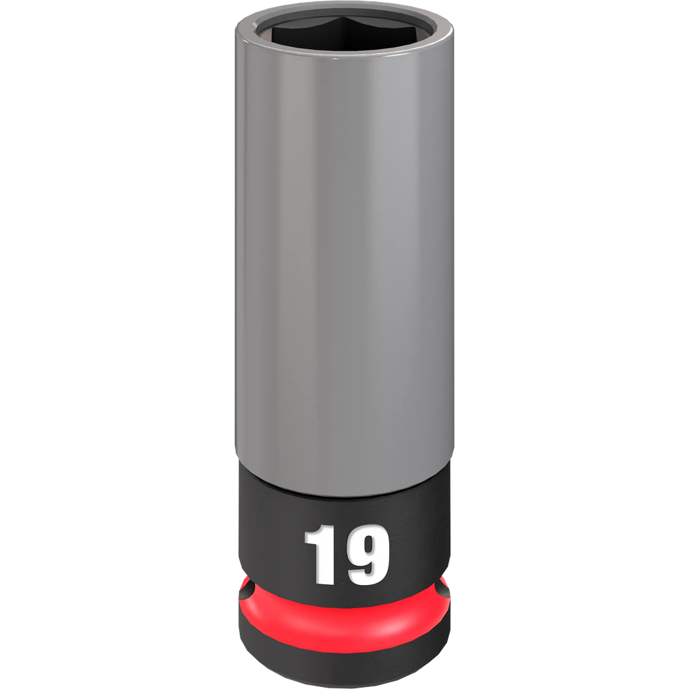 Engineered for the demanding needs of professional automotive service, the Milwaukee SHOCKWAVE Impact Duty 1/2' Drive 19mm Metric Lug Nut Wheel Socket offers a superior combination of high-torque durability and rim protection. Its robust forged steel core is heat-treated for maximum strength, while the innovative ARMOR-GUARD sleeve prevents damage to expensive alloy rims during rapid tire changes. This socket is designed to be a high-ROI accessory for any shop aiming to avoid liability from damaged customer rims while maintaining efficient workflow. Its thin-walled design ensures easy access to recessed lug nuts in tight wheel assemblies without compromising structural integrity. The non-marring internal insert further protects the lug nut finish, keeping fasteners pristine.