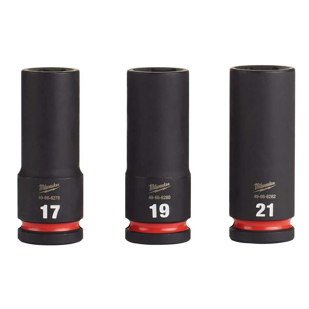 The MILWAUKEE 3-Piece SHOCKWAVE Impact Duty 1/2 in. Drive Metric Deep 6 Point Socket Set is engineered for high-torque applications, offering extreme impact durability. It features the boldest, longest-lasting markings that are stamped and ink-filled for easy socket selection throughout the life of the tool. Constructed from high-strength forged steel, these sockets are optimized for performance in heavy-duty tasks. The non-slip hex geometry is designed to prevent the rounding of fasteners, ensuring a secure grip.