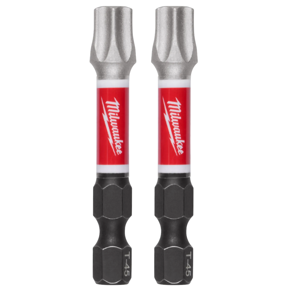 Milwaukee SHOCKWAVE Impact Duty 2' T45 Driver Bits are engineered to be the most durable and best-fitting driver bits for demanding fastening applications. These bits feature a Wear Guard Tip for increased wear resistance and an optimized Shockzone shank that absorbs peak torque to prevent breakage. Constructed from Custom Alloy76 steel, they offer up to 50X the life of standard impact bits while maintaining a precise fit to reduce stripping and wobble.