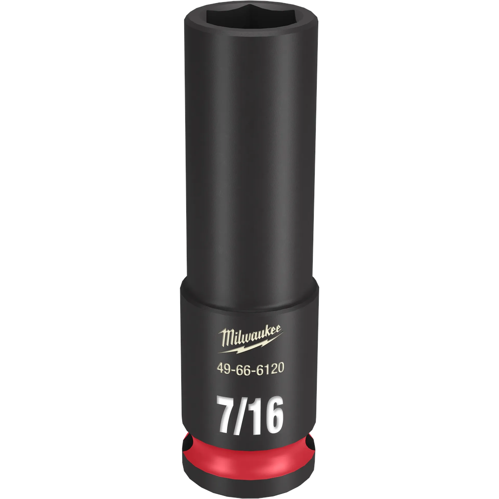 Experience extreme impact durability and superior visibility with the Milwaukee SHOCKWAVE Impact Duty 3/8' Drive 7/16' Deep 6 Point Socket. Engineered for high-torque applications, this socket features bold, long-lasting ink-filled markings for quick identification and a non-slip hex geometry to prevent fastener rounding. Its robust construction from high-strength forged steel ensures performance in heavy-duty tasks, while the dual-hole design and ring groove allow for easy attachment and removal. This socket meets ASME industry standards and is backed by Milwaukee's Lifetime Guarantee.
