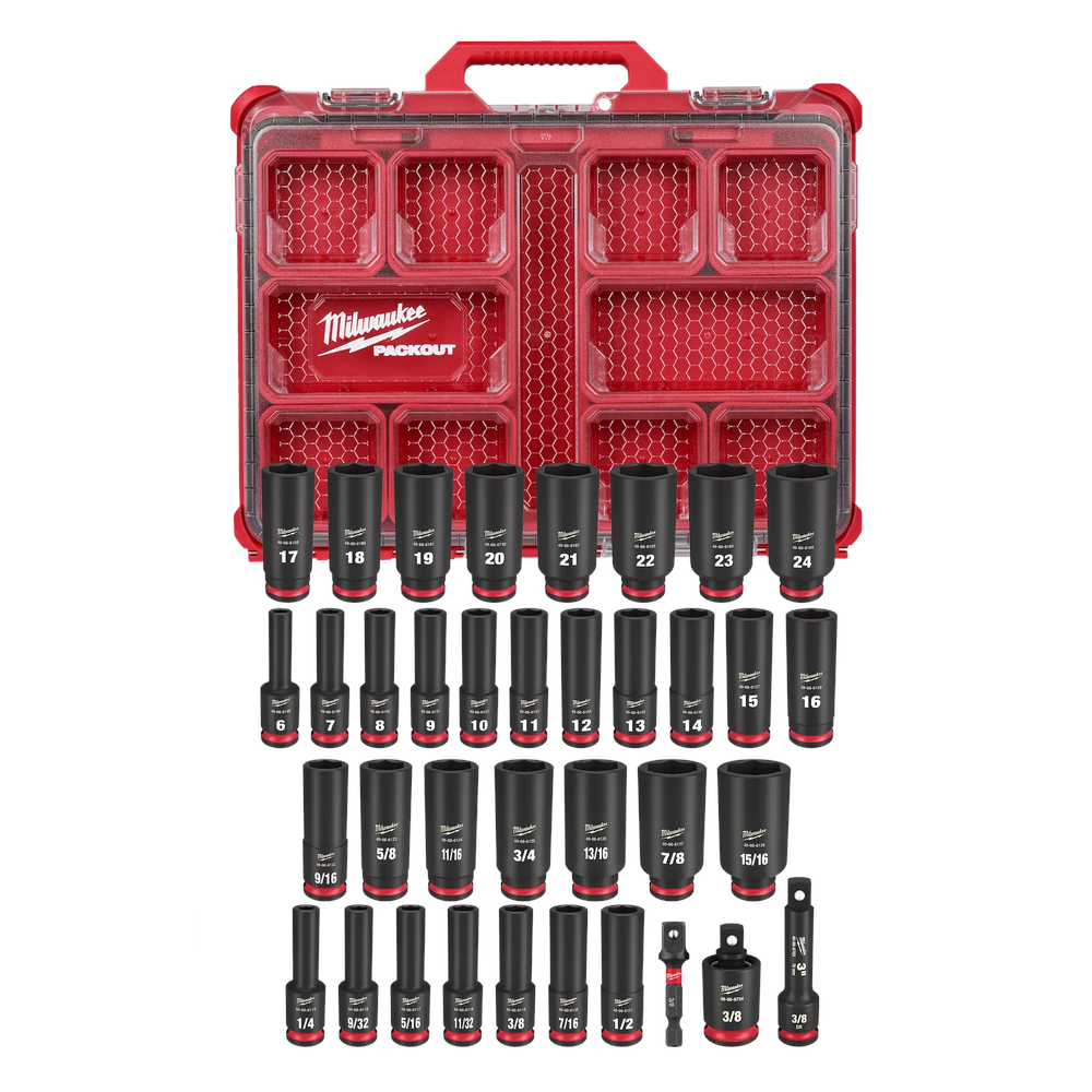 Engineered for professionals, the Milwaukee SHOCKWAVE Impact Duty 3/8' Drive Socket Set (49-66-6805) offers extreme durability and precision for high-torque applications. This comprehensive 36-piece set includes deep SAE and metric sockets, along with essential impact accessories, all optimized for use with 3/8' drive impact wrenches, drivers, ratchets, and adapters. Each socket is constructed from high-strength forged impact steel and features a non-slip hex geometry to prevent fastener rounding, ensuring longevity and reliable performance. The stamped and ink-filled size markings provide clear, long-lasting visibility for quick socket selection. This set is conveniently housed in a low-profile PACKOUT Organizer, integrating seamlessly with the PACKOUT Modular Storage System for easy transport and organization.