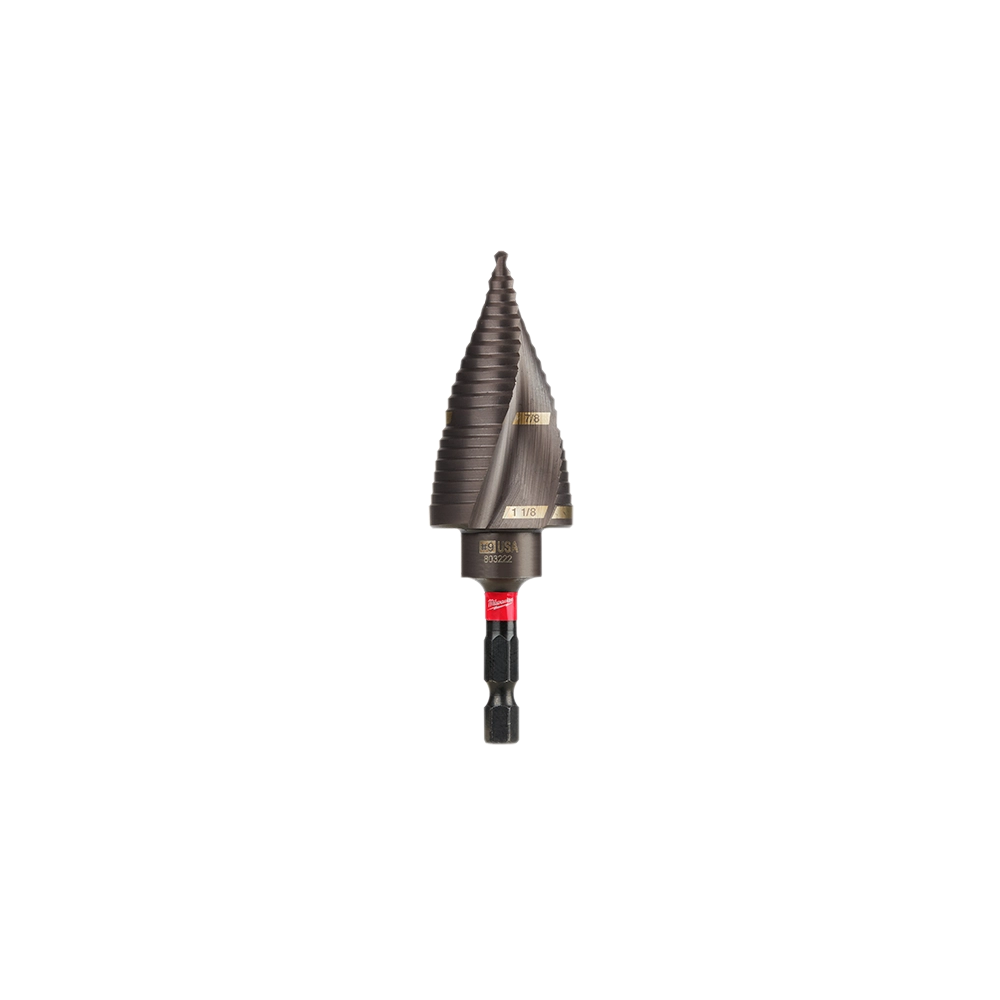 Engineered for durability and speed, the Milwaukee SHOCKWAVE Impact Duty Step Bit #9 delivers the fastest and most robust hole drilling solution. It offers best-in-class performance with impact drivers and can also be used with drills. The bit features a hex shank with an optimized SHOCKZONE for enhanced durability and reduced shank breaks. Its Titanium Aluminum Nitride (TiAlN) coating ensures a 5x longer lifespan, while the Rapid Strike tip and dual spiral flute allow for up to 2x faster holes. Made in the USA with global materials, this step bit is designed for efficiency and longevity on the jobsite.