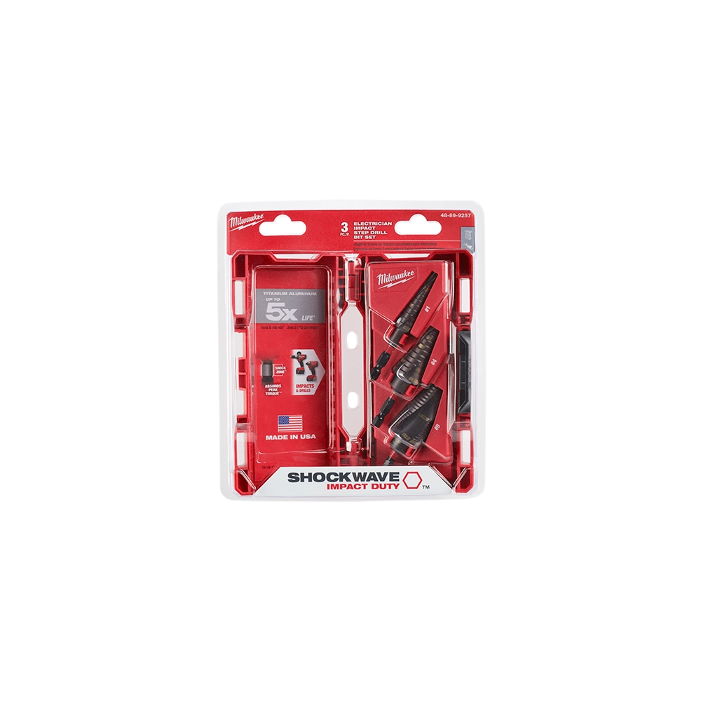 Engineered for durability and speed, the Milwaukee SHOCKWAVE Impact Duty Electrical Kit delivers the fastest hole drilling solution for impact applications. These step drill bits offer best-in-class performance in impact drivers and are also versatile enough for use in standard drills. Featuring a Titanium Aluminum Nitride (TiAlN) coating for extended life and a Rapid Strike tip with a dual spiral flute for faster, more accurate holes, this kit is designed to reduce shank breaks and provide clear size identification. Made in the USA with global materials, it's a reliable choice for demanding electrical tasks.