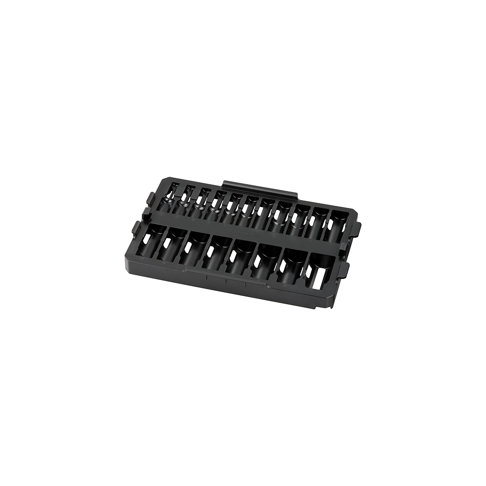 Organize your metric impact sockets with the Milwaukee 49-66-6831 SHOCKWAVE Impact Duty Socket Tray. This durable plastic tray is designed to hold a 19-piece set of 3/8' drive metric sockets, featuring clear size labels for easy identification. Its optimized design allows for seamless integration with Milwaukee PACKOUT organizers and fits conveniently in tool chest drawers. Raised tabs ensure effortless removal from PACKOUT systems, making socket access and organization more efficient than ever before.