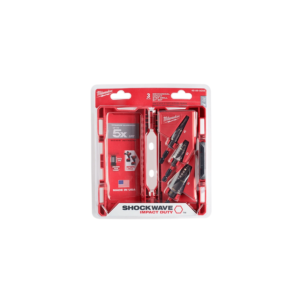 Engineered for durability and speed, the Milwaukee 48-89-9256 SHOCKWAVE Impact Duty Step Bit Mechanical Set delivers the fastest and most robust holes in the market. Made in the USA with global materials, these bits offer top-tier performance with impact drivers and are versatile enough for use with drills. The 1/4' hex shank features an optimized SHOCKZONE for enhanced durability and reduced shank breakage, while the Titanium Aluminum Nitride (TiAlN) coating extends life up to 5 times longer. The Rapid Strike tip and dual spiral flute design ensure faster hole creation compared to competing bits.
