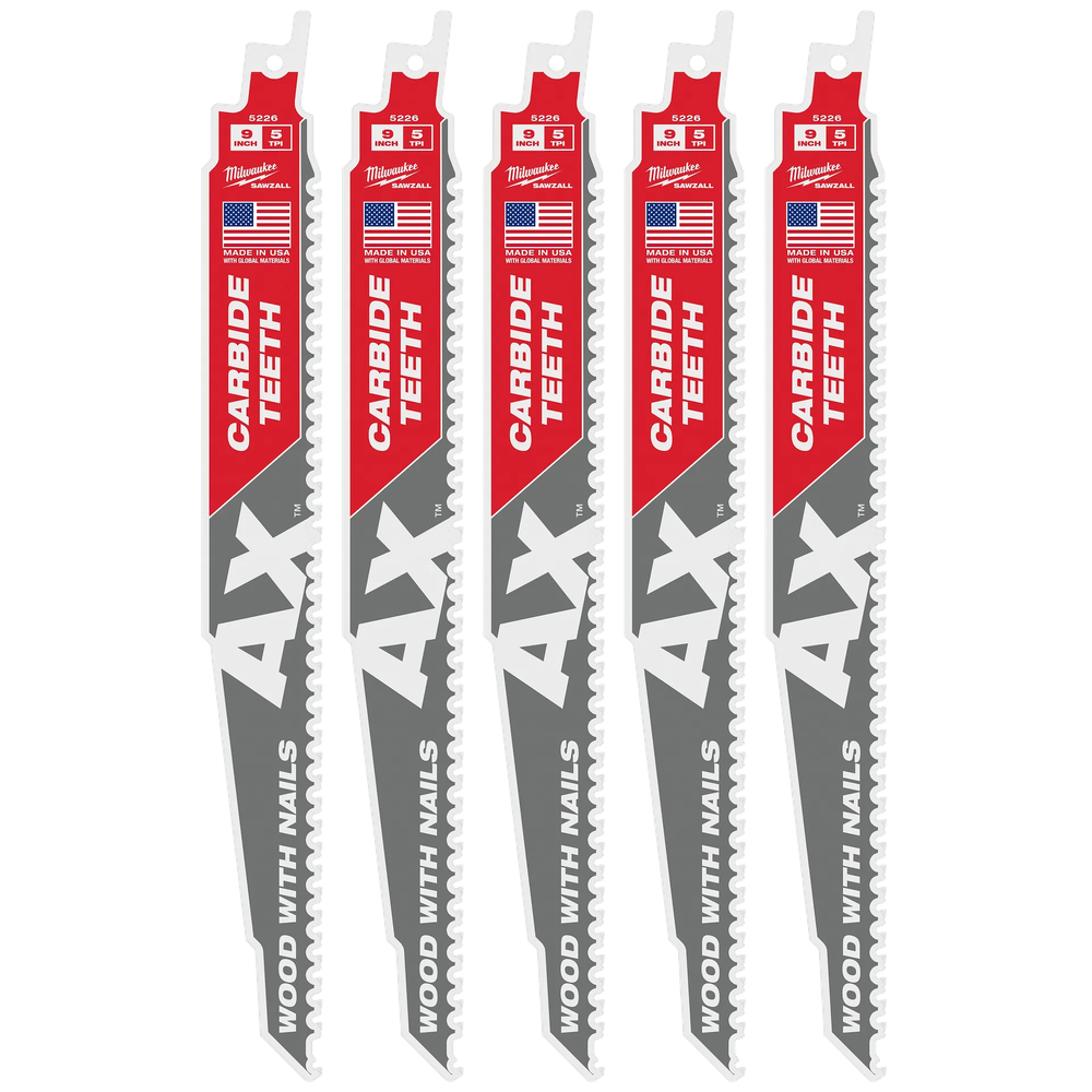 Milwaukee THE AX Carbide Teeth SAWZALL Blade, 9 in, 5TPI, 5-Pack