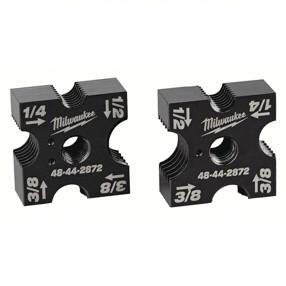 The MILWAUKEE Multi-Size 1/4', 3/8', and 1/2' Replacement Threaded Rod Cutting Dies are engineered to deliver clean, burr-free cuts on threaded rods. Featuring superior blade geometry, these dies effortlessly cut through 1/4', 3/8', and 1/2' mild steel, as well as 1/4' and 3/8' stainless steel coarse threaded rod, all without producing chips or sparks. The innovative four-sided rotatable design allows for all three sizes of threaded rod to be cut with a single tool, enhancing efficiency and convenience for professionals. Clear size markings on the dies, along with distinct upper and lower jaw placement indicators, ensure accurate and easy operation.