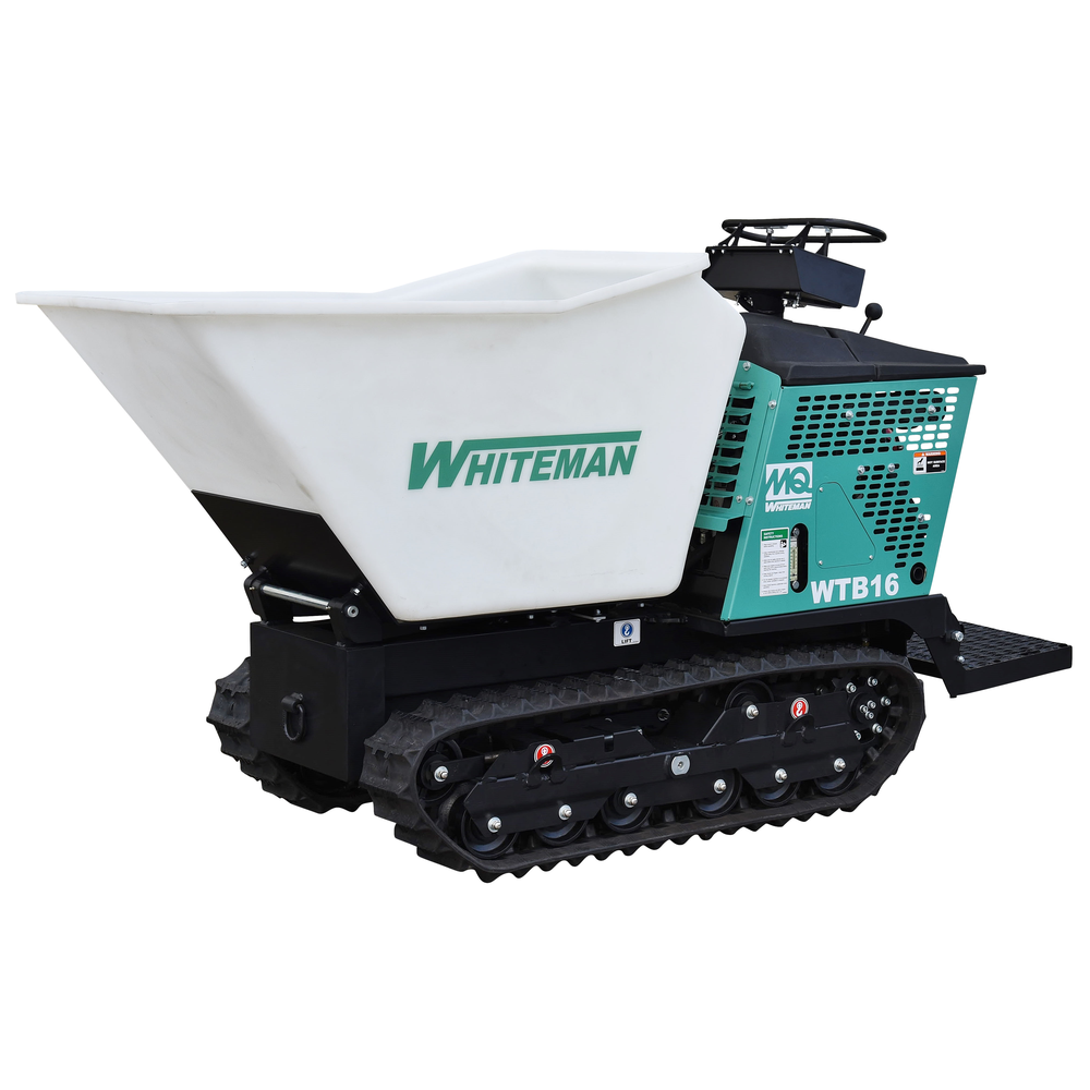 The WTB-16PD is a versatile 16 cubic foot track drive buggy featuring a 180-degree pivot dump capability. This allows operators to discharge material with precision to either side of the machine, making it ideal for trenching, landscaping, and tight-access pours.