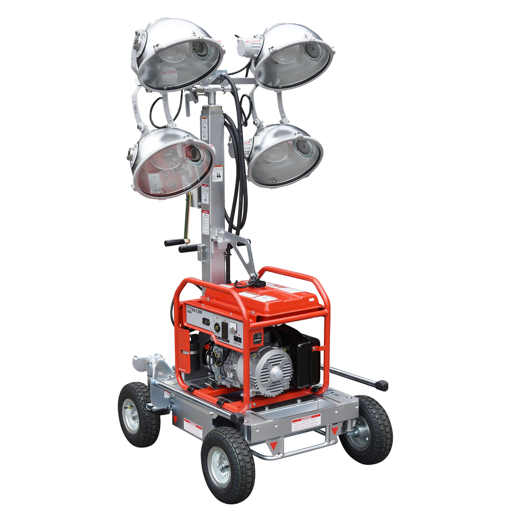The Multiquip GB43SC is a portable, four-wheeled light tower designed for temporary worksite illumination. It features four 400-watt metal halide lamps mounted on a telescoping mast, providing broad-area lighting for construction, maintenance, and emergency applications. The unit is built on a durable steel cart with four wheels for easy maneuverability over rough terrain, and it includes a disc-style base for stability.