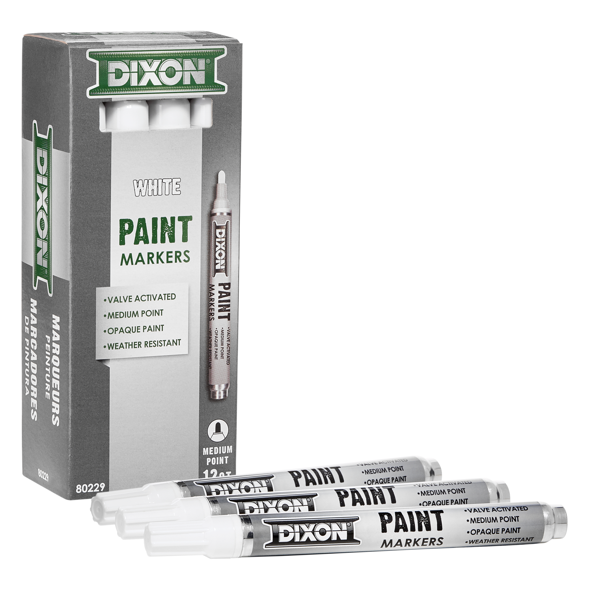 Dixon Paint Markers produce permanent, opaque colors on most surfaces including metal, wood, glass, stone, plastic, leather, vinyl, textiles, ceramics, cement, paper and rubber. These oil-based markers maintain color intensity regardless of the surface to which they are applied. The durable color is lightfast, waterproof and weatherproof. The special valve-action tip prevents dry-out. Dixon Paint Markers feature a sturdy metal barrel and are made in U.S.A.
