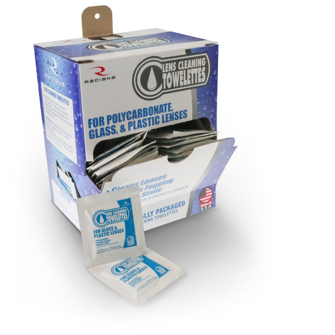 Sturdy, economical lens cleaning accessories provide instant access for all lens cleaning needs in the plant or office. Strategically placed stations will promote proper lens cleaning techniques extending the life of prescription and non-prescription safety glasses. The specially developed formula in the lens cleaning towelettes and lens cleaning stations will clean greasy and oily glasses while providing an anti-fog / anti-static coating. Low lint, non-abrasive tissue leaves lenses clear and streak free. Cleaning wipes for Respirators are also available in an alcohol free option.