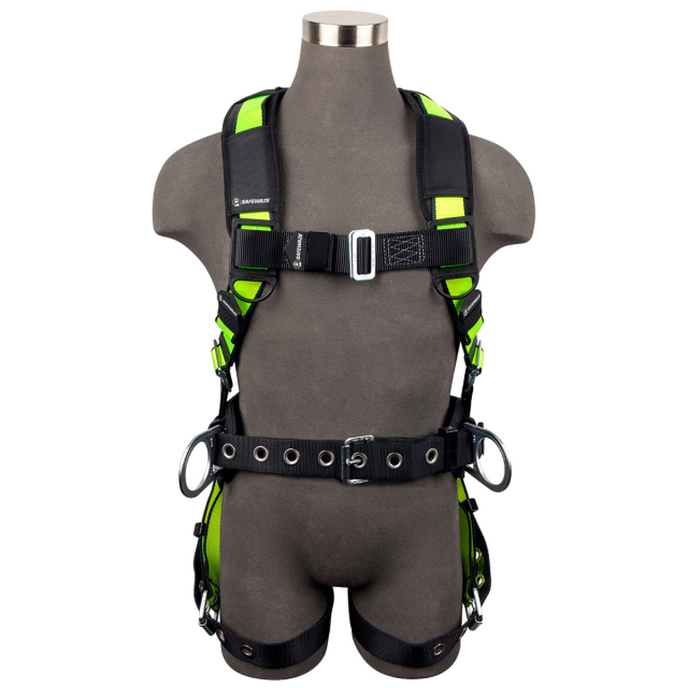 The Safewaze PRO Construction Harness is a dependable workhorse designed for professionals who demand safety and comfort on the job. It features ergonomically designed padding and high-visibility, abrasion-resistant green webbing for enhanced durability and site safety. This harness is built to withstand rigorous conditions with corrosion-resistant steel-plated D-rings and buckle components.