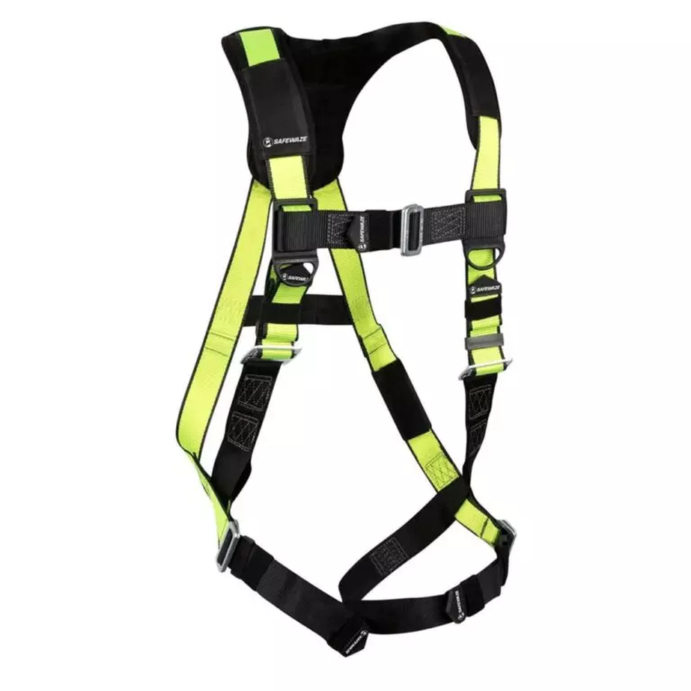 The Safewaze PRO Full Body Harness is a dependable workhorse engineered for outstanding performance and reliability at heights. It features ergonomically designed padding and high-visibility, abrasion-resistant webbing to ensure all-day comfort and long-term durability in rugged environments. Built with premium components including a no-tangle D-ring pad and corrosive-resistant hardware, this harness provides maximum safety for construction, roofing, and industrial applications.