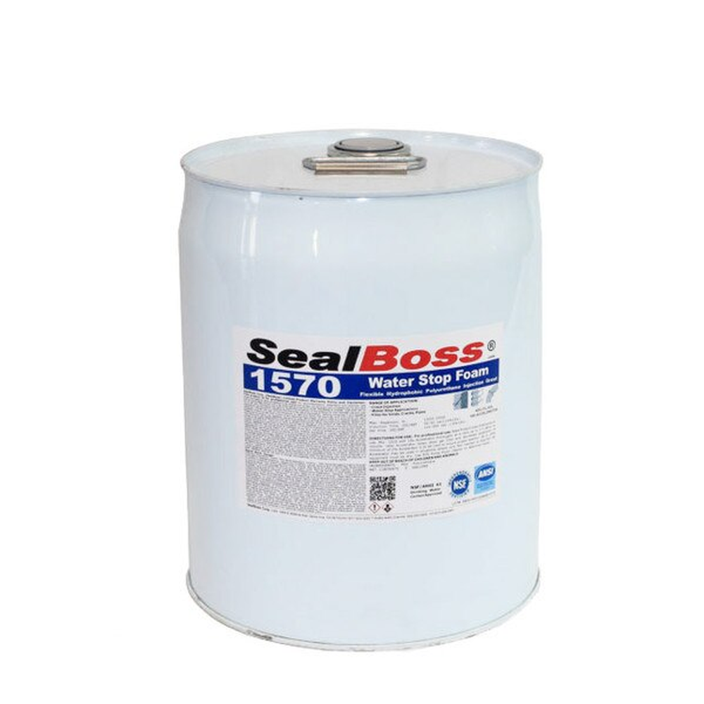 SealBoss 1570 Flexible Water Stop Foam mixed with SealBoss 15x Accelerator is a flexible hydrophobic, water-activated (hydro-active), water cut-off grout and leak-seal foam grout based on a MDI polyurethane. The resin is 100% solvent free and 100% solids.