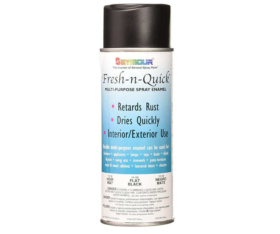 A high quality spray paint available in a wide range of popular colors and economically priced. Black and white available in a gloss or a flat finish. It covers well, dries fast, and holds up well outdoors. Bare or rusted surfaces should be cleaned and primed with Fresh-N-Quick Gray Primer, #11-15.