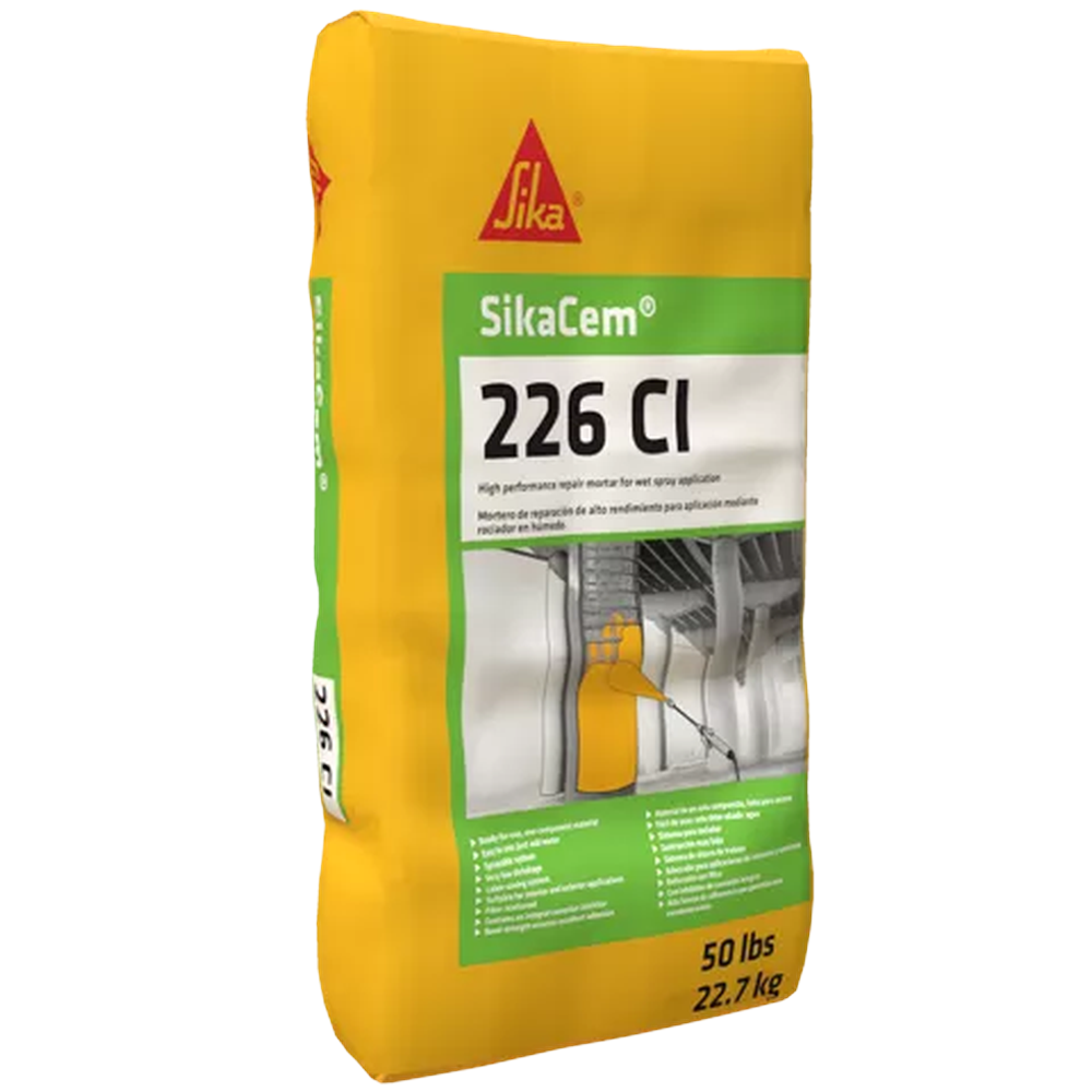 High performance repair mortar for wet spray application. One-component, cementitious, silica fume and fiber reinforced, shrinkage-compensated mortar for overhead and vertical surfaces.