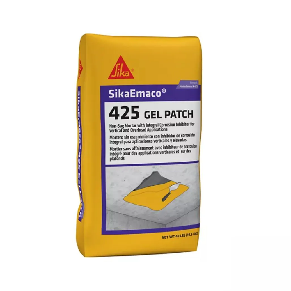 Non-sag concrete repair mortar with integral corrosion inhibitor for vertical and overhead applications. It is a trowel-grade, lightweight, polymer-modified, silica fume-enhanced repair mortar.