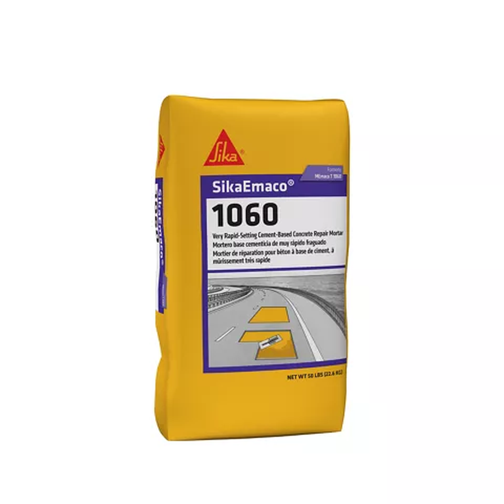 Very rapid-setting, cement-based concrete repair mortar for horizontal surfaces requiring high early strength. Shrinkage-compensated with extra low permeability.