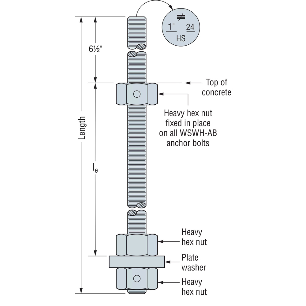 The WSWH-AB is a heavy-duty preassembled anchor bolt used to attach Strong-Wall® high-strength wood shearwalls (WSWH) to concrete foundations. With a 1" diameter and a variety of length options, these anchor bolts offer flexibility for meeting specific project demands. A stamped head makes inspection and identification easy with a No-Equal® symbol, bolt length, bolt diameter and optional “HS” for high strength, if specified.