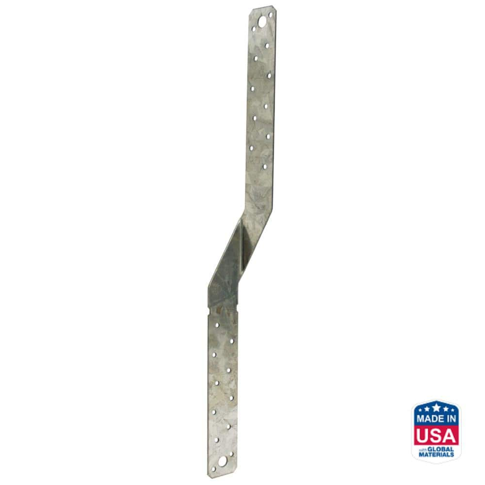 The Simpson Strong-Tie MTS16Z is a 16-inch medium twist strap engineered to provide a secure tension connection between two wood members. It is specifically designed to resist moderate uplift loads at the rafter or heel of a truss, offering an economical and reliable solution for framing. The strap features a specialized 2-inch bend section that minimizes interference at transition points, allowing for efficient installation without wrapping over the truss.