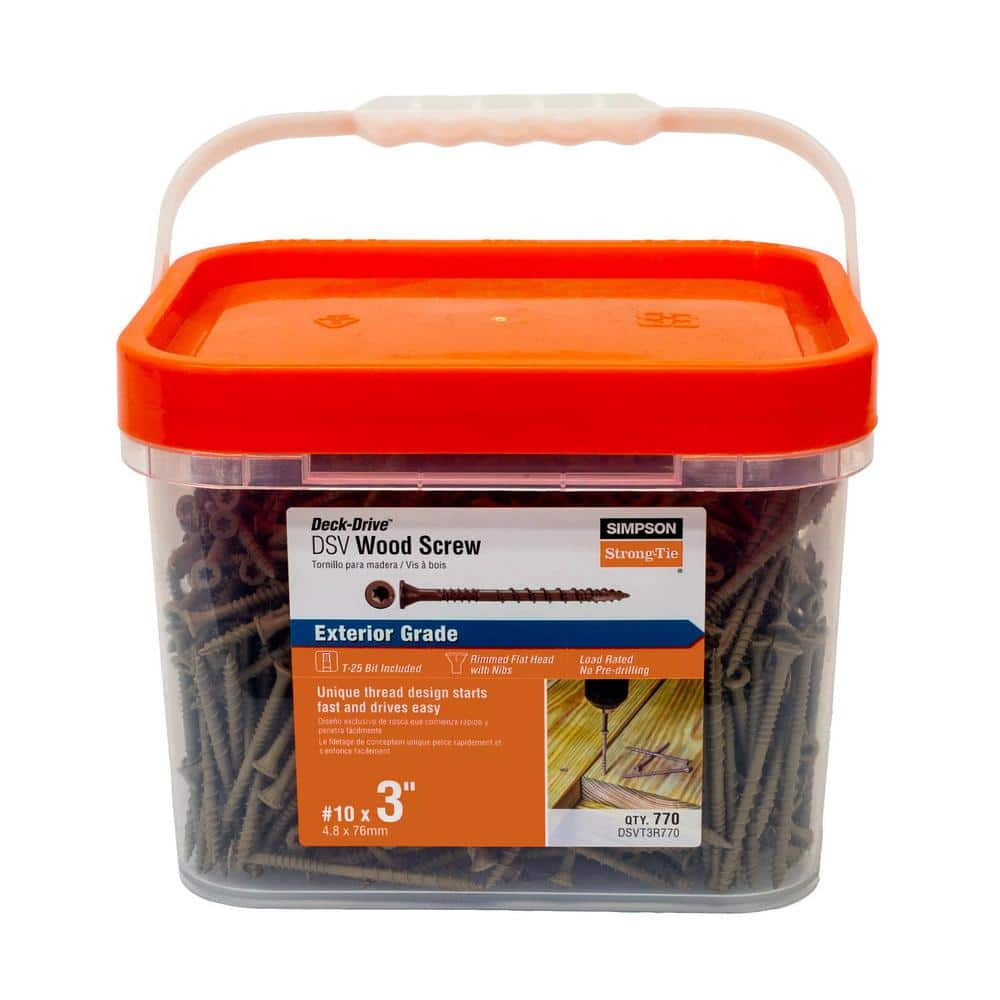The Simpson Strong-Tie DSVT3R770 Deck-Drive DSV Wood Screw is a powerful and load-rated fastening solution designed specifically for preservative-treated decking applications. Engineered for performance and durability, these screws feature underhead nibs and a fast-start tip for easy driving and clean countersinking into modern wood deck boards. The optimized shank design effectively withstands the common swelling and shrinkage of wood, ensuring a stable and long-lasting installation. The Quik Guard corrosion-resistant coating provides excellent protection and blends aesthetically with wood decking.