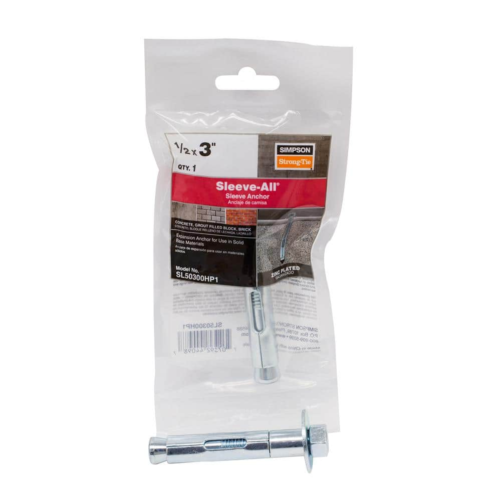 The Simpson Strong-Tie SL50300HP1 Sleeve-All Anchor is a versatile and reliable anchoring solution designed for use in all types of solid base materials, including concrete, brick, and block. This pre-assembled expanding sleeve anchor features a hex head for easy installation with a standard wrench. Its robust construction ensures optimal performance in demanding structural applications, making it suitable for both complex infrastructure projects and DIY endeavors. The Sleeve-All anchor offers secure installation and is available in various head styles to accommodate a wide range of needs.