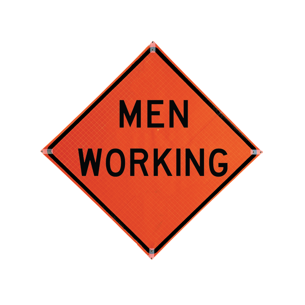 A 36x36 inch orange reflective roll-up sign designed for temporary traffic control and work zone safety, featuring the 'Men Working' legend to alert drivers of construction or maintenance activities ahead.