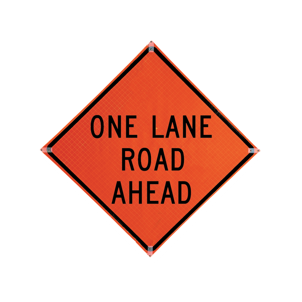 A 48-inch by 48-inch orange reflective vinyl roll-up sign with the 'One Lane Road Ahead' legend, designed for traffic control and road safety applications.