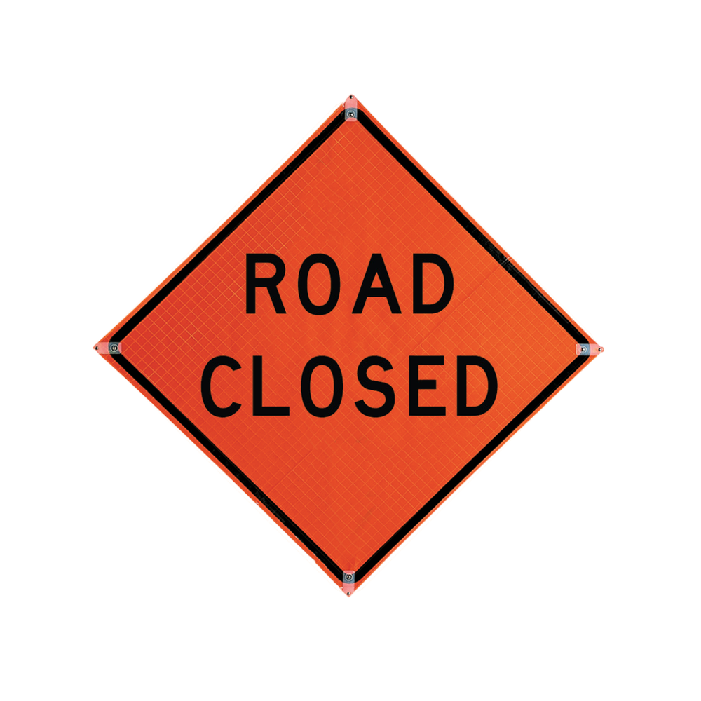 A 36x36 inch roll-up road closed sign designed for traffic control and safety applications, featuring reflective materials for high visibility.