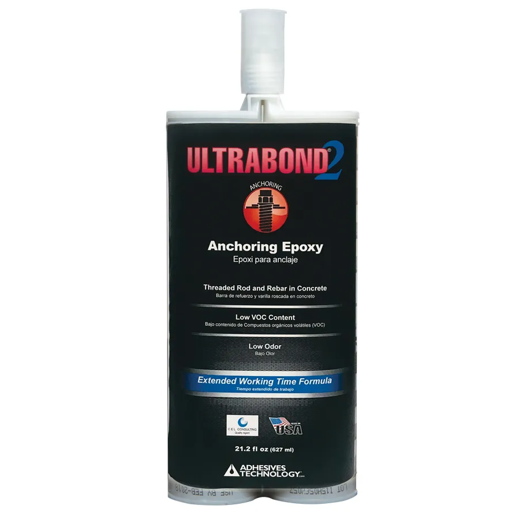 ULTRABOND 2 epoxy provides extended working time in warmer weather with slower curing for southern climates. It's designed for anchoring threaded rod into concrete with a 1:1 mix ratio.