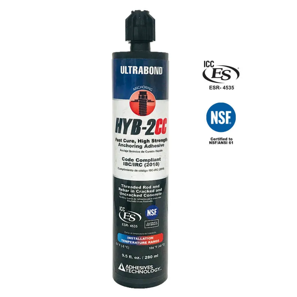 ULTRABOND HYB-2CC is a high-strength hybrid anchoring adhesive approved for multiple anchor types including fractional and metric threaded rod & rebar. It cures completely in 30 minutes at 70F and is approved for use in dry, damp, and water-filled holes.