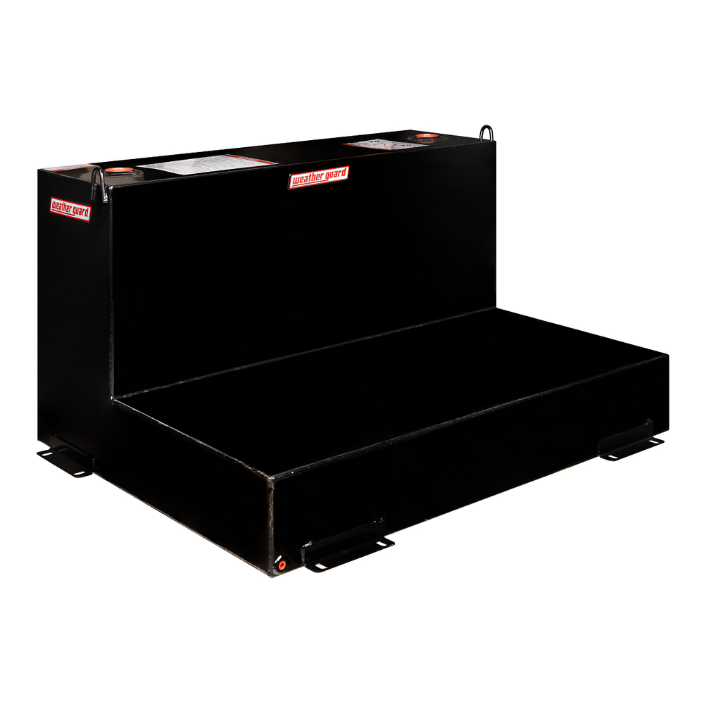 The WEATHER GUARD Model 362-5-02 is a 110-gallon L-Shape steel transfer tank designed for transporting diesel fuel and hydraulic fluid in full-size pickup trucks. It fits snugly in truck beds and attaches to Gull Wing or Saddle Boxes, featuring a vented filler cap to prevent pressure build-up and heavy-duty construction for commercial use.
