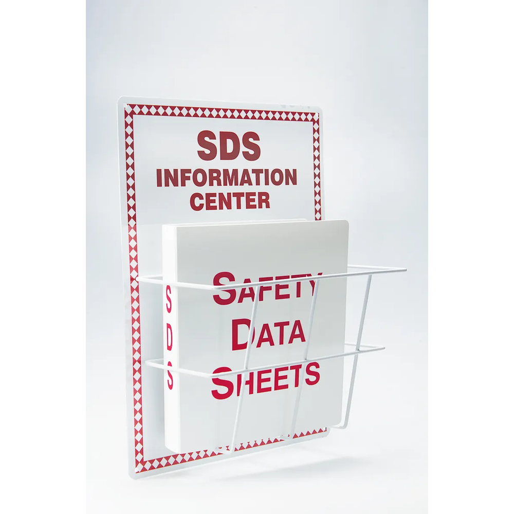 This safety data sheet center provides easy access to SDS for personnel while keeping the area organized. It features a sturdy aluminum backboard with a high-visibility red diamond border.