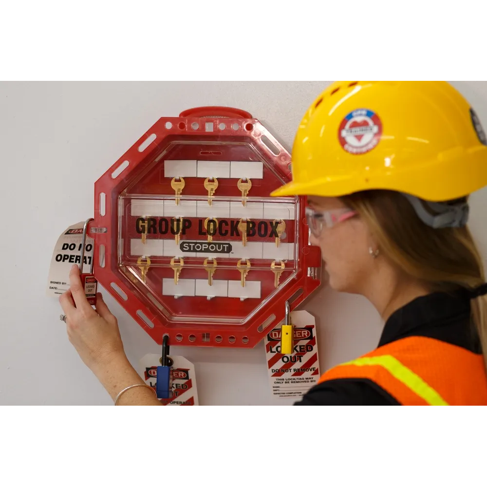 A secure lock box shaped like an octagon to convey STOP message for group lockout procedures. Contains 16 hooks for keys and can be secured with up to 44 padlocks.