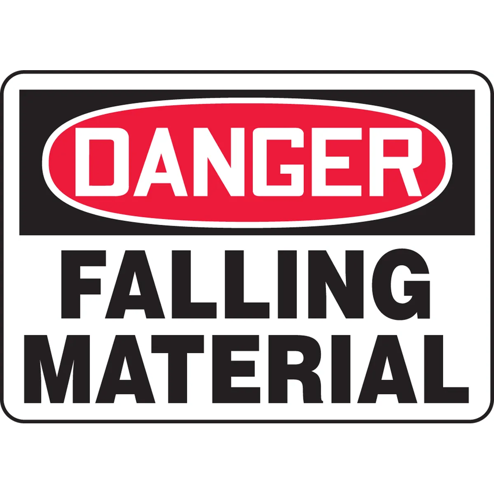 Traditional OSHA-style sign warning of falling material hazards. Encourages awareness of overhead dangers and protection from gravity-related injuries.