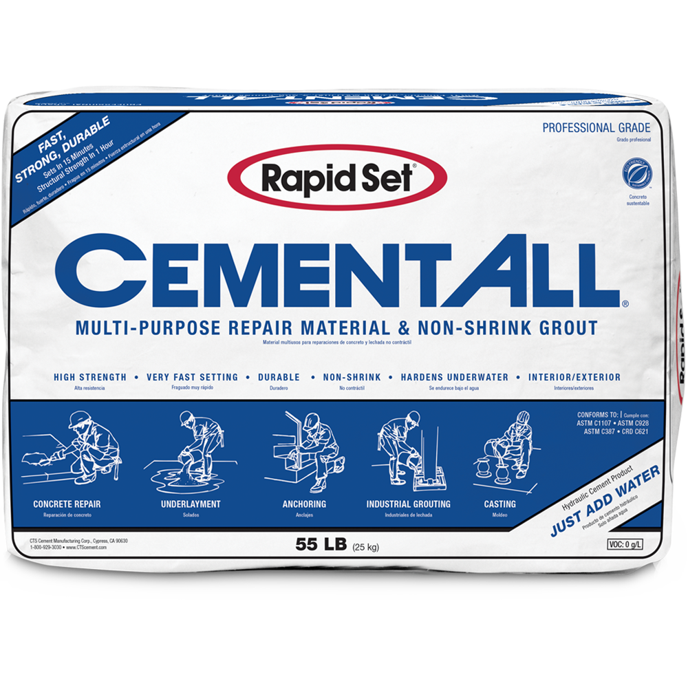 Cement All® is a high-performance, fast-setting concrete repair material that is durable in wet environments. Apply Cement All from featheredge to 4” thick. Use for general and structural concrete repair, doweling and anchoring, industrial grouting, formed work, vertical and horizontal trowel applications. Conforms to: ASTM C387, C928, C1107, CRD C621.