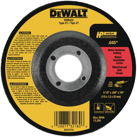 Ideal for cutting in ferrous and stainless steel metals, DEWALT Type 27 HP Metal Cutting Wheels are crafted with aluminum oxide grain for fast, aggressive cutting and extended life. A proprietary material mix ensures long wheel life.