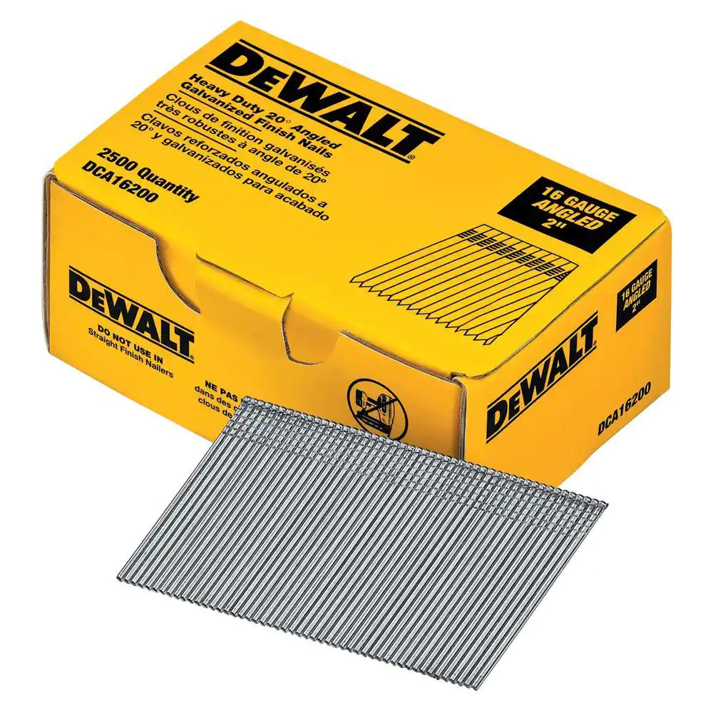 DEWALT 16-Gauge 20° angled and straight galvanized finish nails are designed to cover all interior finishing applications. The range of applications for the production trim carpenter includes installing window and door casings or crown molding and cabinetry. DEWALT 20° angled nails will provide high holding power and ease of drive.