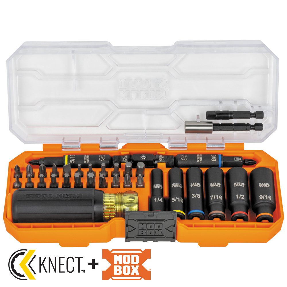 This 41-piece impact-rated screwdriver and socket set is part of Klein's KNECT system, offering seamless transition between hand and power tools. It includes various bits, sockets, and drivers in a modular case that connects to other Klein cases.