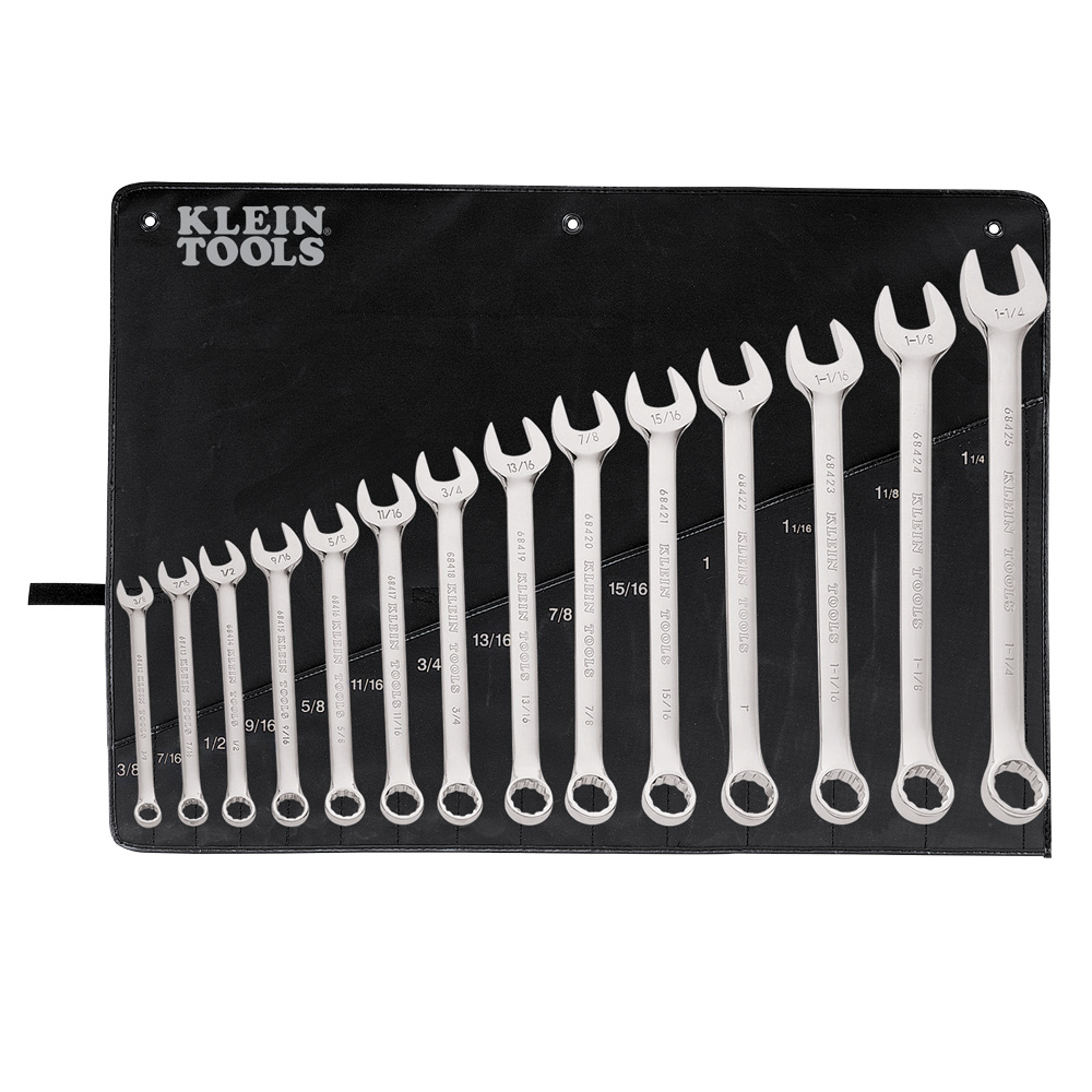 The Klein Tools 14-Piece Combination Wrench Set includes drop-forged alloy-steel wrenches with offset ends for confined areas. It comes with a marked pouch for organized storage.