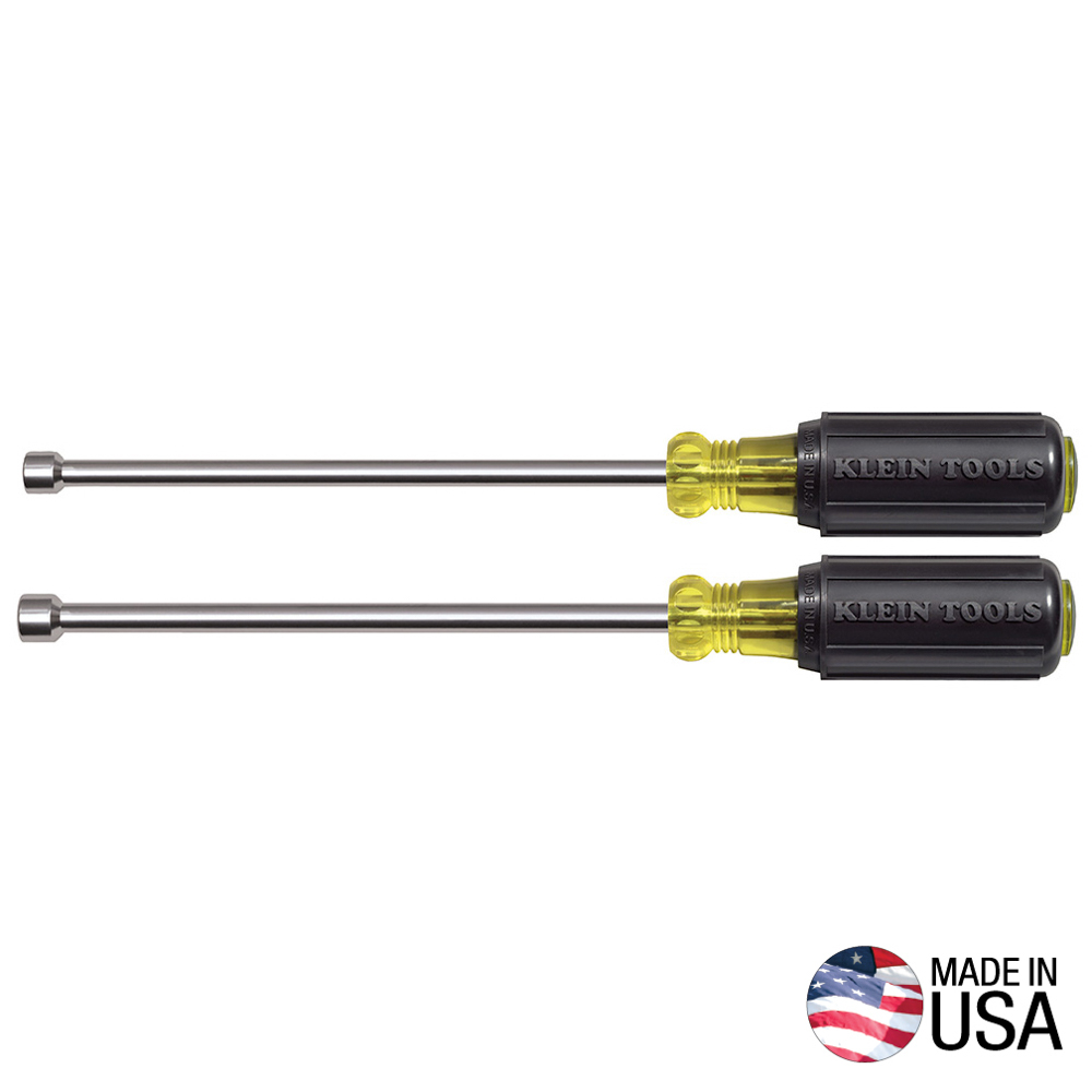 This Magnetic Nut Driver set from Klein Tools features two of the most frequently used nut driver sizes with full 6-inch hollow shafts. The set includes color-coded handles for easy identification and rare-earth magnetic tips.